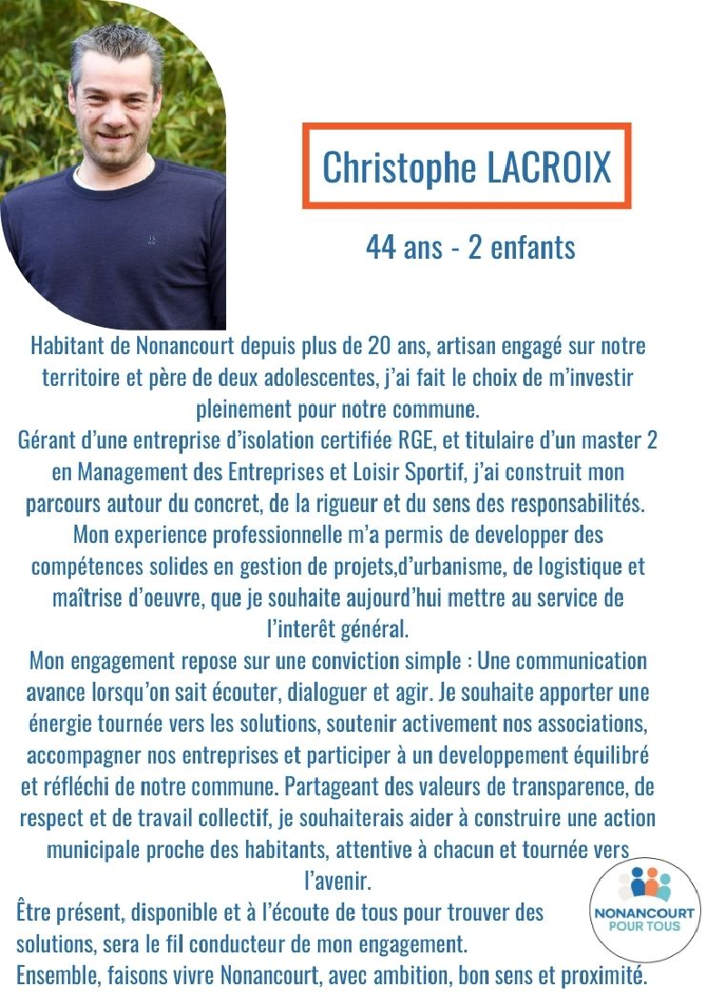 Habitant de Nonancourt depuis plus de vingt ans, artisan engagé et père de deux adolescentes, Christophe Lacroix connaît notre commune de l’intérieur. Gérant d’une entreprise certifiée RGE et formé au management, il a développé une solide expérience en gestion de projets, urbanisme et coordination.
