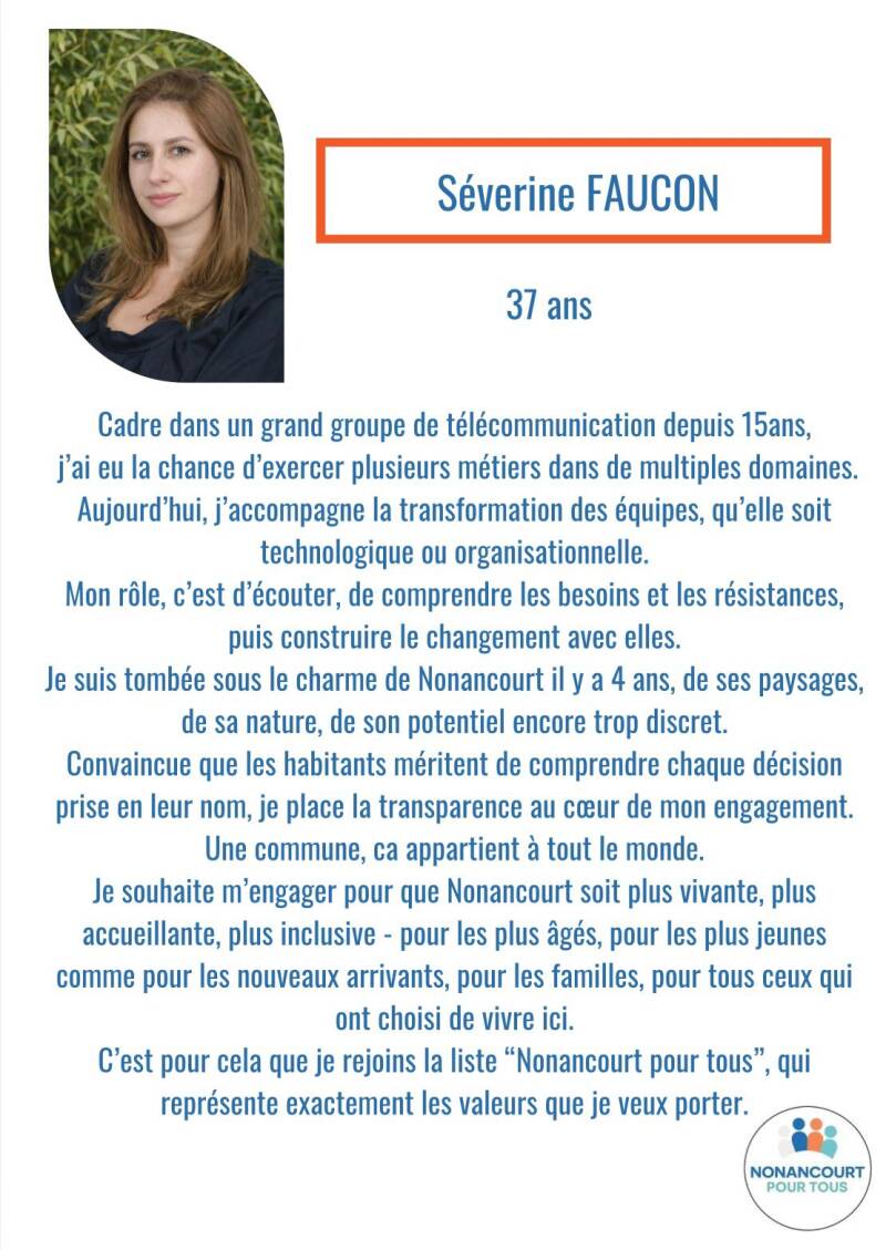 Arrivée à Nonancourt il y a quatre ans, elle s’est attachée à notre commune et place la transparence au cœur de son engagement.
